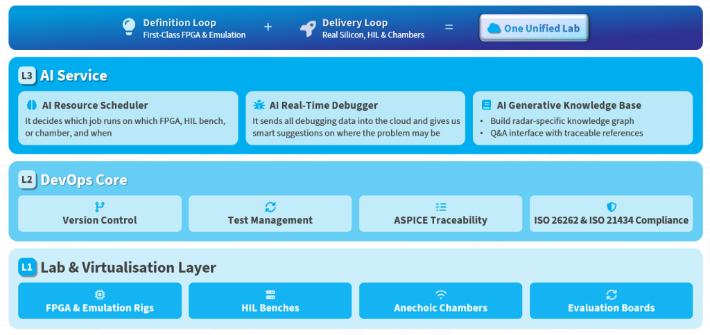 Calterah Radar Cloud Lab aims to address these challenges with its three-layer design: a lab virtualization layer that registers physical assets (FPGA, HIL benches, evaluation boards, etc.) for unified scheduling and remote access; a DevOps Core layer that manages version control, tests, ASPICE traceability, etc.; an AI service layer consisting of a resource scheduler, a real-time debugger, and a generative knowledge base accessible through natural-language queries.